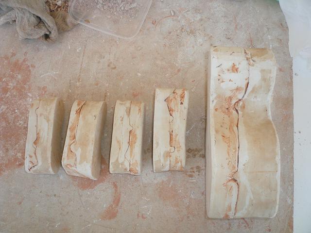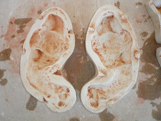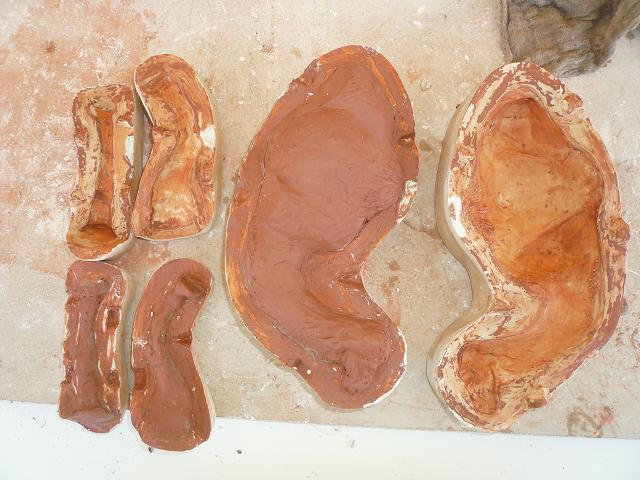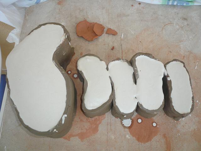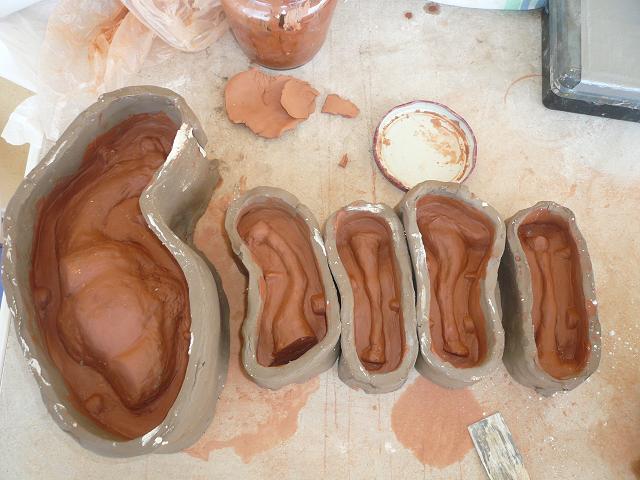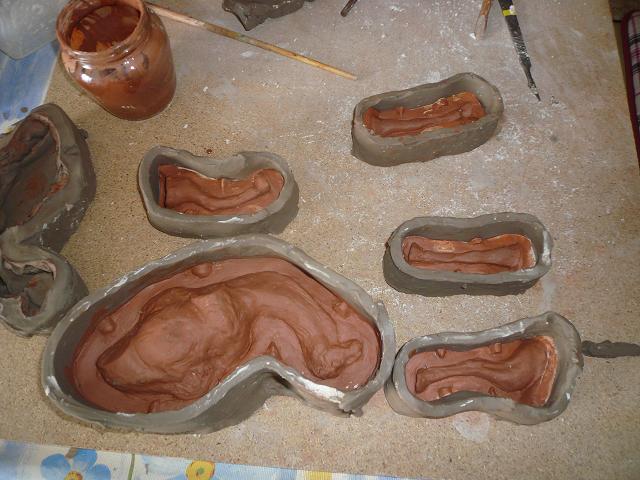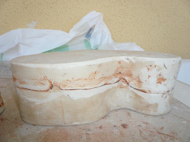 Una vez pasado el tiempo necesario, abrir el molde con cuidado, se suele meter una espátula por medio dando uin golpe seco y desunir con cuidado. Abrirlo, quitar la pieza original y limpiar el interior del molde y dejar secar bien. Una vez seco, llenar cada mitad del molde con barro fresco, untar con barbotina cada parte y unir fuertemente las dos piezas del molde, dejarlo un buen rato y separar las piezas del molde, si podeis sacar la pieza de la parte interior del molde la sacais y si veis que se resiste esperar un rato que se endurezca la pieza. El tiempo que esté la pieza dentro del molde irá encogiendo lentamente y será mas facil sacarla. Puede que el molde no esté muy bien echo y se estropée algo la pieza, pero como esta fresca la retocas o arreglamos, eso será ya la práctica la que os dé la experiencia y corrección de defectos.