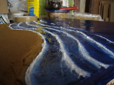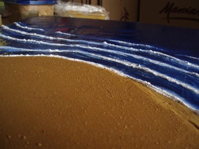 Pues la verdad es que es muy bonita, si quieres un consejo acércate a un almacén de materiales de construcción y diles que te den un poco de arena de sílice, es muy muy fina, le das una mano de agua rebajada con cola blanca y espolvoreas el sílice y te dará un aspecto perfecto imitando la arena, esto serviría con arena de playa pero su grano es mucho mayor que el del sílice y podría parecer una playa de guijarros, por otro lado no toda la arena de la playa tiene el mismo color yo daría un poco de pincel seco con un tono marfil a la zona "no mojada".