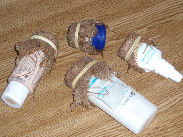 Empapamos bien los trozos de tela con el agua con azúcar (esto lo usan algunas abuelas para “almidonar” los tapetes de ganchillo) así al secar quedará rígida y con la forma que le hayamos dado.Después sujetamos la tela a los objetos que serán el molde colocandola una goma, de manera que no queden pliegues ni arrugas, al tener las hebras bastante separadas se adaptan bastante bien a cualquier forma.