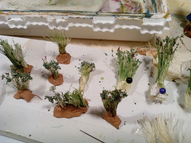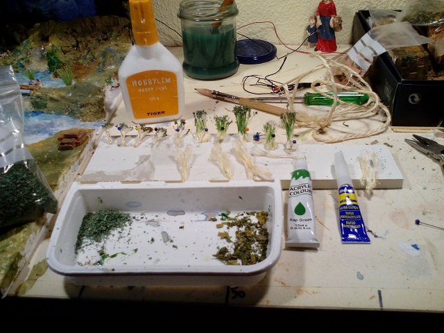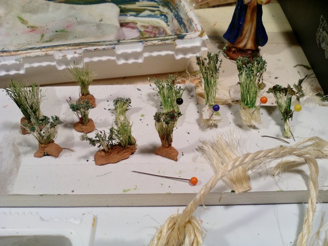 Este es un procedimiento sencillo y rápido para hacer plantas que sirven para poner en maquetas, belenes, dioramas,etc y el resultado es bastante bueno a mi parecer. Se cortan trozos de cuerda de pita. En un extremo se pone un poco de pegamento rápido. Una vez seco se deshilacha y recorta de la forma deseada por el otro extremo, se dan unas pinceladas de color verde adecuado, quizá con algún toque amarillo o rojo. Poniéndolas en una base de arcilla puede hacerse un huerto.