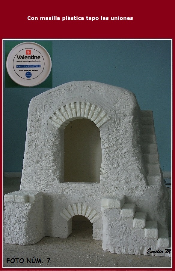 En lo que tienes que tener precaución, es cuando vayas a mojar la fachada, que no se mojen los escalones de las escaleras ni tampoco los ladrillos de los arcos, y así evitarás que cuando espolvoree la escayola no se pegue.