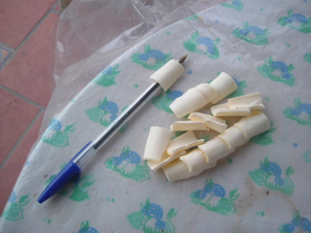 De igual manera que tu , una vez cortada la teja, la colocas sobre un soporte de plastico para darle la forma de curva, hazte de un palito del grosor que tu quieras y las curvas en el, no se te pegará.