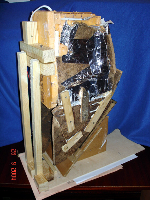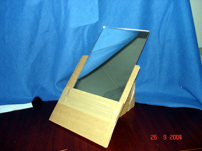 · 204-Disposición del espejo E3, espejo que se coloca de pie en la base girado 45º. La foto permite observar la raja que se ha trazado en el poliestireno y que sirve de “rail” al espejo.