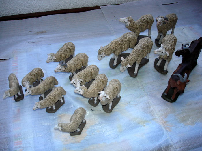 · 101-El ganado, a estabular que forma el objeto real. En este caso está formado por corderos de 11, 16 y 20 cm y dos cabras de 20 cm. Todos ellos de J.Joaquin Pérez. La cueva del Nacimiento en donde está el aprisco tiene figuras de 24 cm de J.L. Mayo.