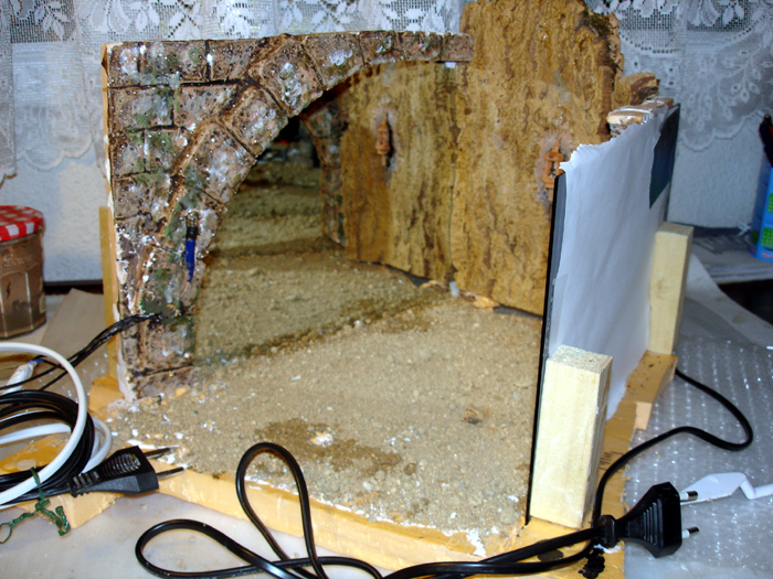 Aquí no hay consideraciones de celaje a tener en cuenta ya que el fondo forma parte de la propia construcción. La iluminación se consigue con el fondo de la casa de arriba y la antorcha viva (un diodo fijo y otro centelleando) en una pared.