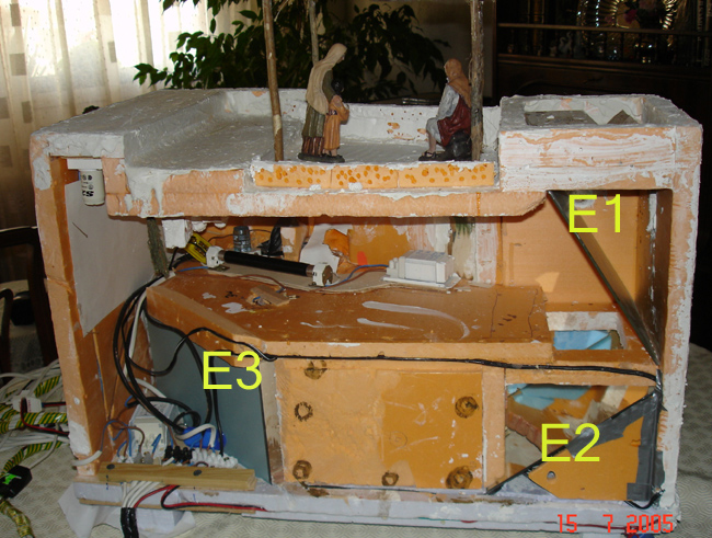 · 203-Colocación del pueblo, donde se con más detalle la colocación del pueblo y su paisaje anterior. A la izquierda podemos observar el fondo del pueblo, el celaje, que se plasma en una cartulina blanca que iluminaremos ad-hoc.