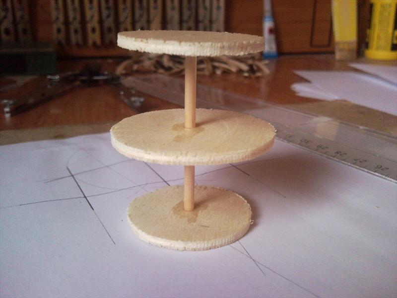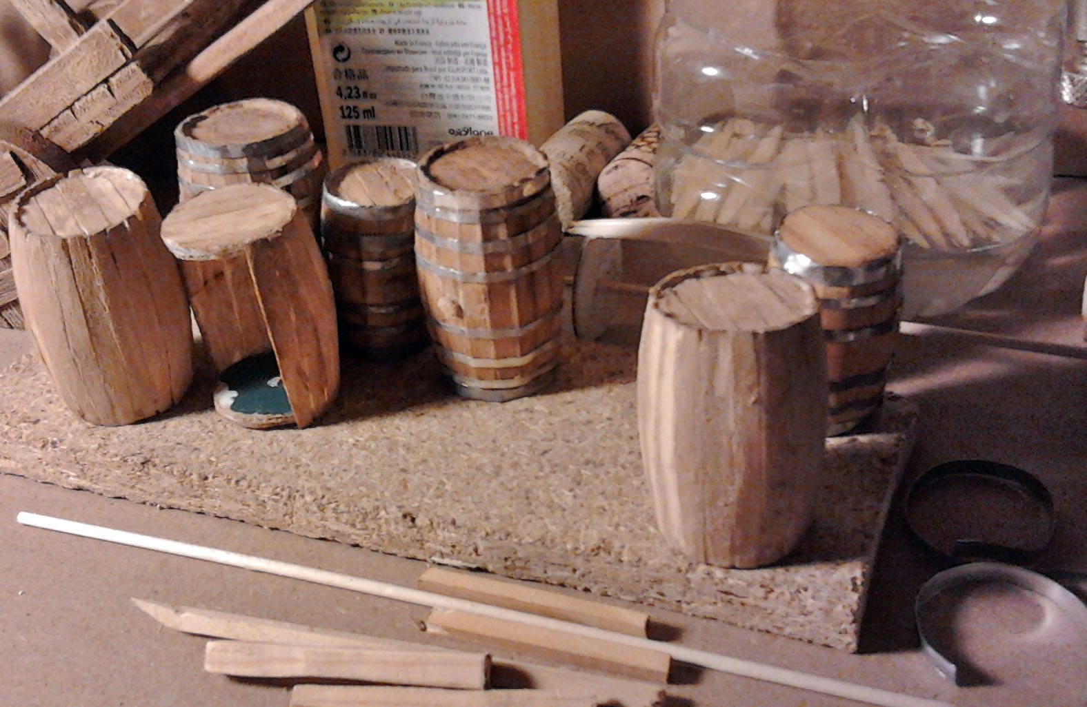 Las duelas o tablas son palillos de dientes planos que se curvan teniéndolos un par de días en agua y poniéndolos en una plantilla a secar como veréis en la foto.