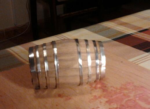 Se pinta con nogalina al gusto de cada uno y por ultimo se cortan tiras de metal o aluminio de 4 mm el primer aro y de 1,5 los demás estas medidas son según el gusto de cada uno.