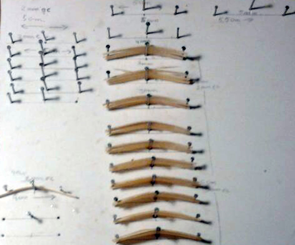 Las medidas entre las puntilla o clavos es de 6 cm el clavo central se sube 3 mm en este caso, dependiendo de la curvatura que se le quiera dar a la duela.
