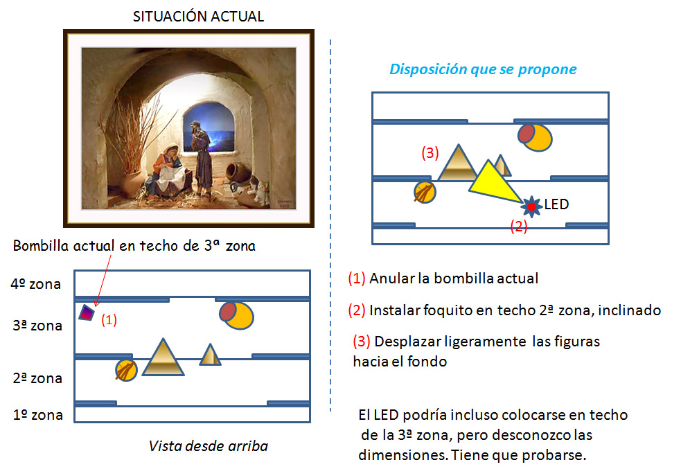 Se trata de sustituir la luz fuerte del tercer espacio por una luz de un foquito, lo que subdividiría el tercer espacio en dos. Uno iluminado fuertemente y el resto en semi-penumbra, o poco iluminado. La dirección del haz de luz debería ser inversa a la del actual, de tal forma que no apareciese la luz por detrás de la figura si no por delante (que en sí es un pequeñísimo defecto del diorama actual). Debería iluminar únicamente la figura principal, es decir la Virgen y el (inexistente) Niño, quedando s. José en un medio tono por reflejos. Dificultad principal: el foco debe ser muy pequeño. Se proponen dos soluciones; las dos con LEDS de distinto tipo. ¿Por qué LEDs? Porque son de pequeño tamaño, tienen una luz polarizada y por tanto actúan como foco, o como foquitos, mejor dicho.