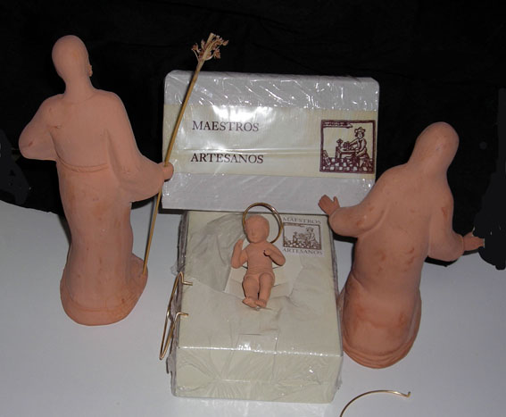 Este nacimiento que os pongo es de Maestros Artesanos, los vende asi para que cada cual lo decore a su antojo con telas y pinturas, mide 21 cmts. y es de barro cocido, se lev podria sacar buen partido y ademas tienen bastantes piezas, lo suficiente como para hacerun buen belen, abrazos