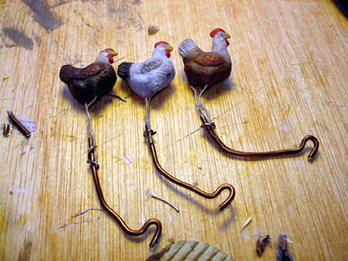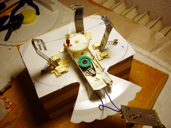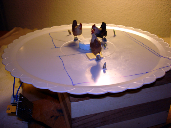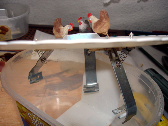 El conjunto está formado por tres gallinas, cada una apoyada en el extremo de un balancín, que a su vez está retenido, por el otro extremo, por un muelle y tensado por un hilo que cíclicamente tira de él según el movimiento de rotación del motor de c.c. Una vez dispuesto un motor de c.c., con sus engranajes y su regulador, el elemento esencial es el buen funcionamiento del balancín; es decir: