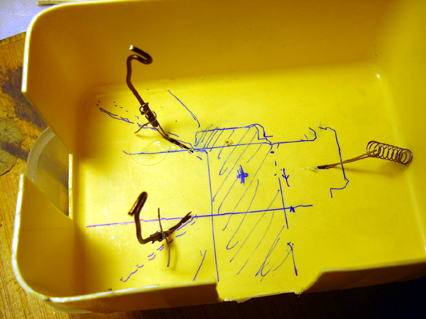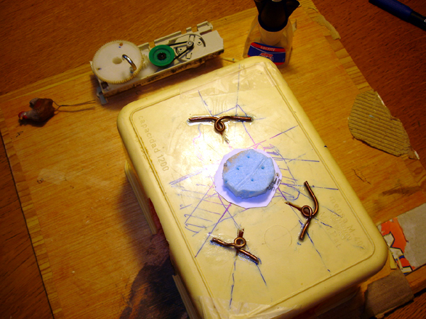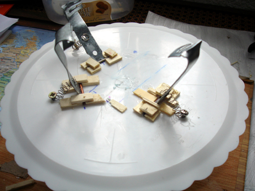 A una pequeña distancia, se pegará una alambre de longitud suficiente para hacer el papel de eje del balancín. Se pega con cianocrilato en abundancia, manteniendo el conjunto apretado durante unos minutos con unas grapas. Ver la foto y fichero <