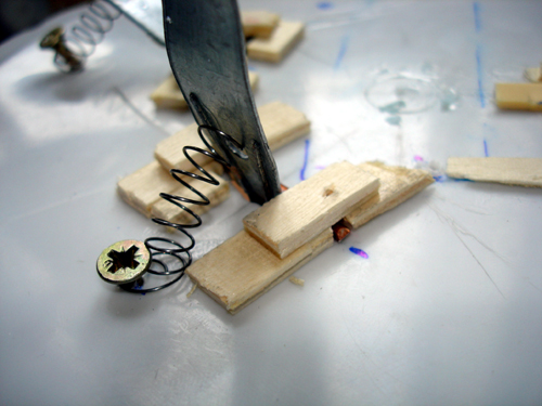 El muelle se coloca aprovechando por un extremo el agujero del balancín y por el otro con un tornillo al plato. Aunque sobresalga no hay problema porque despues se recubre el plato con poliestireno. El agujero ya existe en este tipo de fleje. Ver foto y fichero <