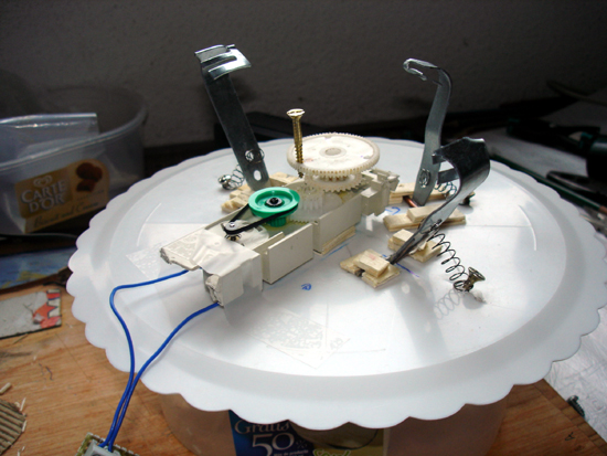 Finalmente se instalaba el motor como se indica en la primera de ellas, se unió el rotor con un hilo de plástico con uno de los balancines y aunque funcionó, cabeceaba. Es decir la gallina picoteaba una vez a la derecha y otra a la izquierda, temblaba; el movimiento no era estable, en fin un desastre.