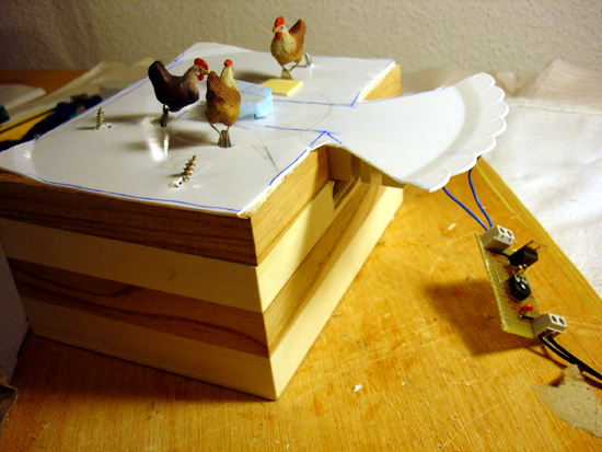 Se recomienda, una vez seleccionado el soporte de la escena, dibujar sobre el mismo los perfiles de las figuras y componentes a instalar. Por debajo, el motor y por encima la ubicación de las tres gallinas, la posible localización del punto de giro de los balancines y la colocación de otras figuras adicionales. Todo ello a fín de: