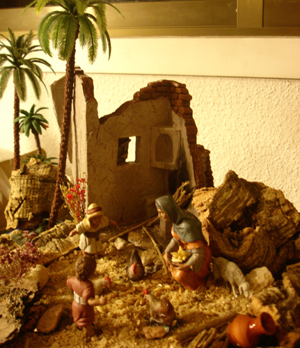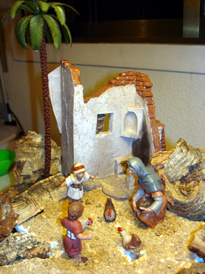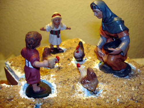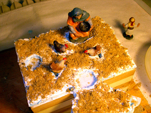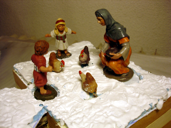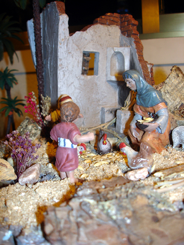 Se ha elegido una escena en la que una Sra. da de comer a las gallinas, aprovechando una figura de JL Mayo, así como unos niños alrededor, con figuras de JJ Pérez. Todo ello cerca de una casa medio en rujínas, unas palmeras y el contorno bordeado por rocas bajas (corcho). Esto es lo que se muestra en la foto y fichero <