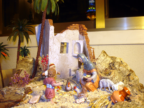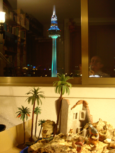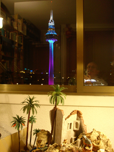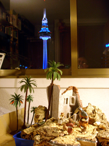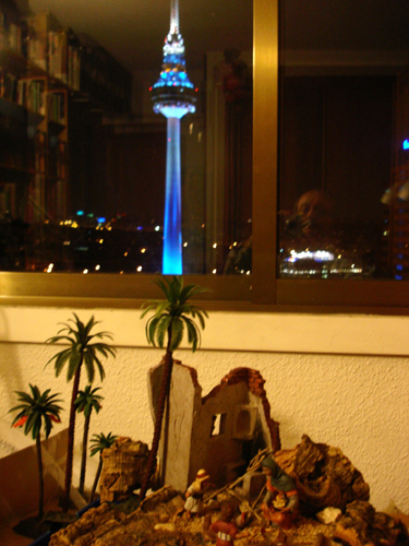 Querida y misteriosa Gloria, la luna tiene un problema en mi casa y es que sale por el Sur y la torre del Pirulí la tengo por el Norte. Las habitaciones que dan al sur no son de trabajo, por lo que hacia allí no hay nunca fotos. Y esto explica la dificultad de que salga la luna por este lado donde trabajo mis Belenes/Pessebres.
