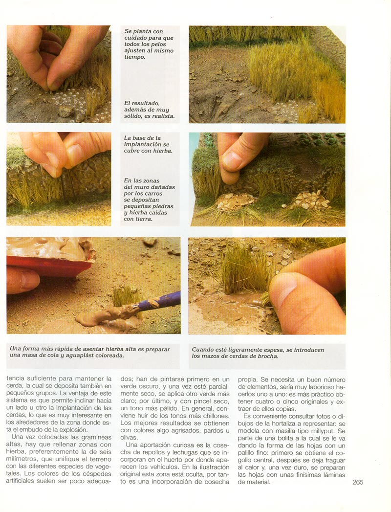 Otra opción, que puedes realizar, si no puedes hacerlo con plantas vivas, es coger en verano paja seca, (de la más fina que encuentres, para eso son mejor las malas hierbas que crecen en las cunetas del campo) te armas de paciencia y en un trozo de porex las vas clavando una a una echandoles pegamento para que se sujeten bien, una vez realizadas las hileras y seco el pegamento, recortas la paja a una altura uniforme y que queden por debajo de la altura de las rodillas de las figuras, expolvoreas tierra para tapar el porex y ¡Voila! ya tienes un campo de trigo recien segado.