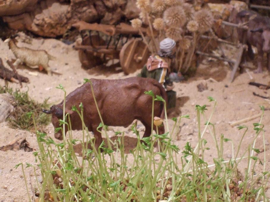 Otra opción, que puedes realizar, si no puedes hacerlo con plantas vivas, es coger en verano paja seca, (de la más fina que encuentres, para eso son mejor las malas hierbas que crecen en las cunetas del campo) te armas de paciencia y en un trozo de porex las vas clavando una a una echandoles pegamento para que se sujeten bien, una vez realizadas las hileras y seco el pegamento, recortas la paja a una altura uniforme y que queden por debajo de la altura de las rodillas de las figuras, expolvoreas tierra para tapar el porex y ¡Voila! ya tienes un campo de trigo recien segado.