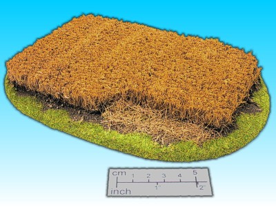 Otra opción, que puedes realizar, si no puedes hacerlo con plantas vivas, es coger en verano paja seca, (de la más fina que encuentres, para eso son mejor las malas hierbas que crecen en las cunetas del campo) te armas de paciencia y en un trozo de porex las vas clavando una a una echandoles pegamento para que se sujeten bien, una vez realizadas las hileras y seco el pegamento, recortas la paja a una altura uniforme y que queden por debajo de la altura de las rodillas de las figuras, expolvoreas tierra para tapar el porex y ¡Voila! ya tienes un campo de trigo recien segado.