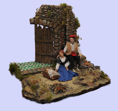 Este es un Belen de hace dos años. La cabeza i manos de José i Maria, son de barro compradas en Napoles i pintadas por mi, la cabeza del Niño Jesus es de un muñeco, repintado. Los vestidos hechos con la colaboración de mi madre. La intención era construir un Belen estilo Napolitano: figuras vestidas i ambientadas en su "lugar". Así que yo tambien he vestido las figuras al modo de mi tierra.