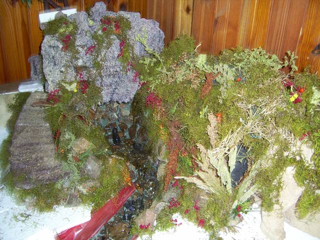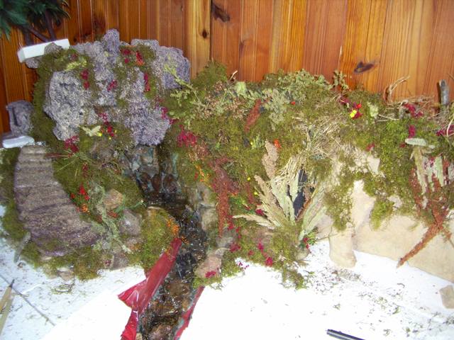 Les cuento que la mayoría de las rocas son de verdad, menos la carcaza que cubre el bidón de la cascada y la cueva del nacimiento esas son de porex pintado con tierra de color y cola y espolvoreado con arena.