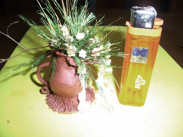 Lo decoré con flores secas y simulé el agua con silicona fría.