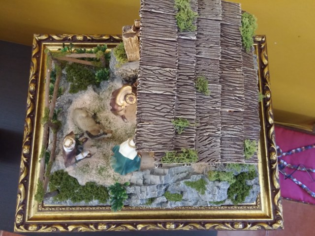 las dimensiones son de 48x38x30 y está hecha con porexpan extruido y expandido. Con figuras de 11 cm. y luz de led, en una tira de 6 puntos de luz.