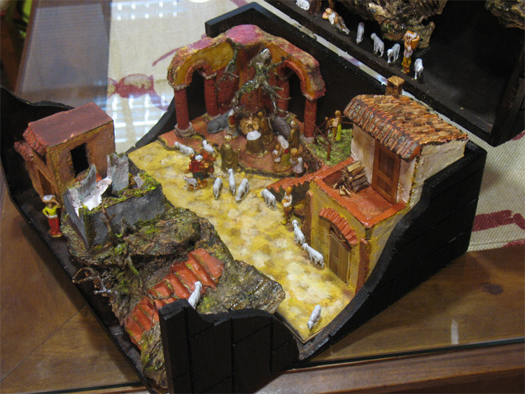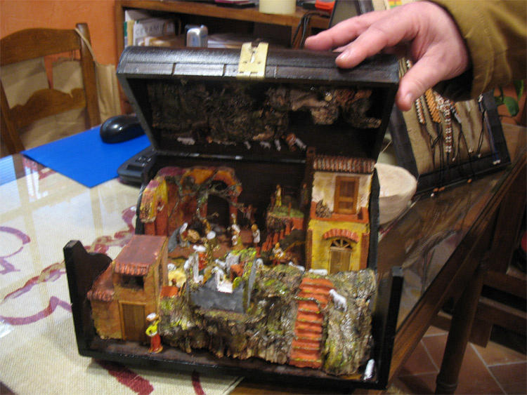 Bien te contestare a una de tus preguntas ,el pasado fin de semana en el encuentro forero de Sanguesa ,nuestro compañero del foro Armillo nos enseño un belen ( Italiano ) que compro hace un tiempo y que esta dentro de un baul ,las dimensiones eran de unos 40x 20 x 15 mas ó menos y era una preciosidad ,asi que si te animas y lo haces mas grande sera para verlo .