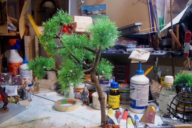 Hola Jose Antonio, lo veo bastante bien, sólo añadir unas cuantas más sobre todo en la rama que ve de frente en esta última foto casi hasta la base de donde salen las demás ramas y si puedes le das con spray de pintura en tono verde o las sumerges en aguarrás o acetona para matar el brillo que tienen las plantitas de plástico, he visto por ahí que así se quita ese brillo antinatural del plástico, puedes hacer la prueba con las que veo que tienes sueltas en la mesa; por lo demás está quedando estupendo.