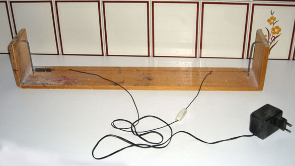 Una vez que determines la longitud del hilo que necesitas, te buscas la forma de fijarlo a la altura que desees de una plancha de madera que te sirva de base y lo conectas a los terminales que instales mediante unos muelles, que tendrán la función de mantener tenso el hilo, ya que al calentarse se dilata y se destensaría si no le pones los muelles.