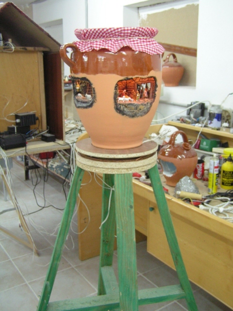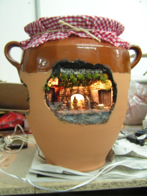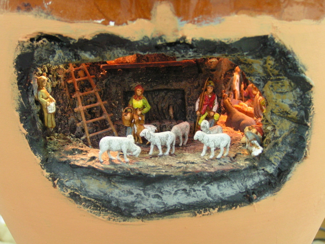 Este Belén que podeis ver esta construido en un jarron de Ceramica donde se me ocurrio realizar 4 escenas distintas, La Anunciación de Maria, La Anunciación a los Pastores, El Portal de Belén y la Carabana de Reyes. Todo es de pequeñas dimensiones dado el poco espacio que tiene el Jarron y las figuras son de Landis de 3,5 cm.