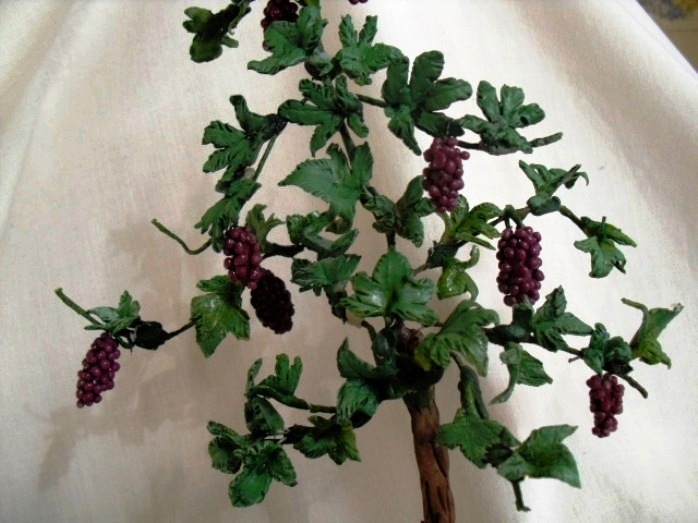 Hola Maru, me alegra que te haya gustado la parra y sobre todo los racimos, si miras un poco más arriba verás que hago un mini paso a paso de como la realicé; todo ella está hecha en porcelanda fria, tronco, hojas y racimos, éstos se hacen con porcelana teñida de color uva, hago muchas pequeñas bolitas y las voy pegando unas a otras sobre un alambre forrado y despues se les da color y un poquito de brillo con barniz cerámico. Espero que te haya ayudado.