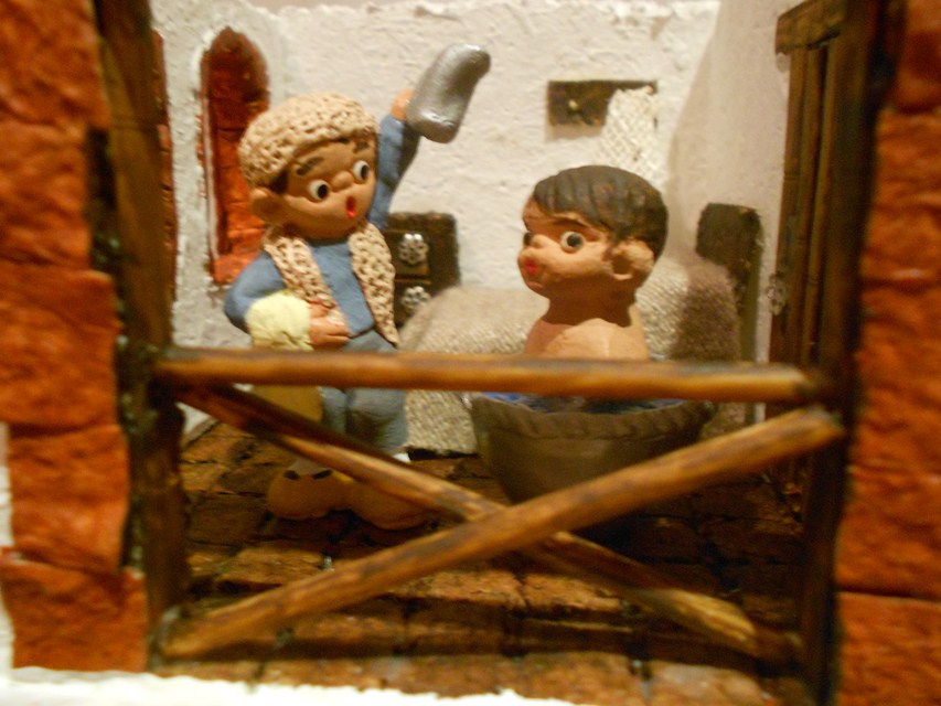 quería enseñaros la nueva posada que he hecho para el belén de este año. Después de ver las maravillas de cosas que se hacen en este foro, me siento muy pretenciosa de enseñaros esta, pero al final me he animado pensando que quizás pueda ayudar a otros novatos como yo, que con poca práctica, pocos medios y materiales fáciles de encontrar se puede hacer una construcción al menos que quede "resultona". He estado todo el verano modificando figuras de alborox con ayuda de una dremel y pasta de modelar de secado al aire, y después pintadas con acrílicos. Pues con la pasta que me sobró he hecho los ladrillos de las ventanas, los barriles, los platos, la comida, etc. Las piedras que rodean las puertas y el balcón están hechas de cartones de huevos, y los barrotes con palillos de dientes. Las puertas y el techito con un mantel de caña de bambú de los chinos (la idea es de Demo). Se deshace, se pintan las tablitas y se pegan con cola de la forma que se quiera. Las paredes son de corcho normal, tengo un amigo con una tienda de electrodomésticos que me trae cuando tiene, las he pintado mezclando un poco de cola con la pintura blanca que tenía, la que me sobró de mi casa, sin añadirle agua y a pegotones. Quizás ahora la ensucie un poco con una idea que me ha dado una amiga, veremos el resultado. Y en la azotea tengo pensado poner un tendedero, pero lo dejaré para el final