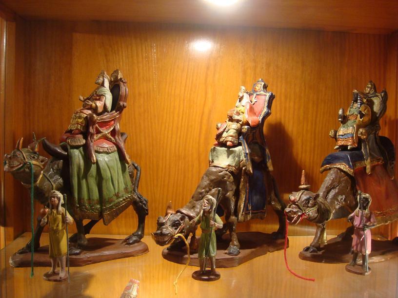 Desde hace algunos años tengo esta cabalgata especial. Los pajes son de unos 8cm, por tanto los camellos con el rey poco más de 20 de alto y más de 25 cm. de largo. Los pajes recuerdan algo las pastores pequeños de Teixidor ( cara, turbante y tobillos anchos), pero la pintura es tremendamente colorista y son evidentemente posteriores. Los camellos parecen divertidos y sonrientes ,con dientes arriba y abajo, además uno saca la lengua. Los reyes y los pajes son de molde, los camellos parecen moldeados de manera desenfadada y puede apreciarse las impresiones manuales. El conjunto es tremendamente interesante. Alguna orientación?