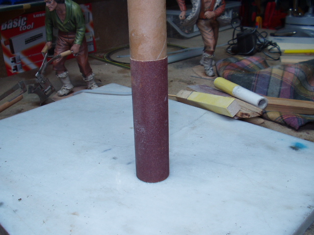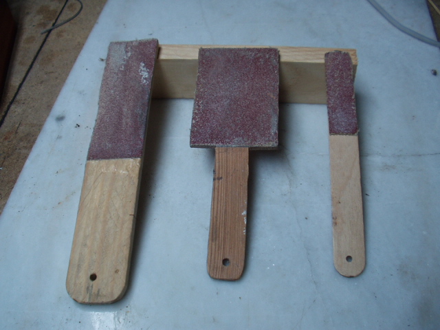 Aquí os dejo algunas fotos de herramientas que utiliza mi padre para lijar. Básicamente, son distintos trozos de madera y tubos de cartón con diferentes formas adaptadas a cada tipo de trabajo (arcos, esquinas,etc) sobre los que ha pegado papel de lijar de distinto tipo de grano (según necesidades).