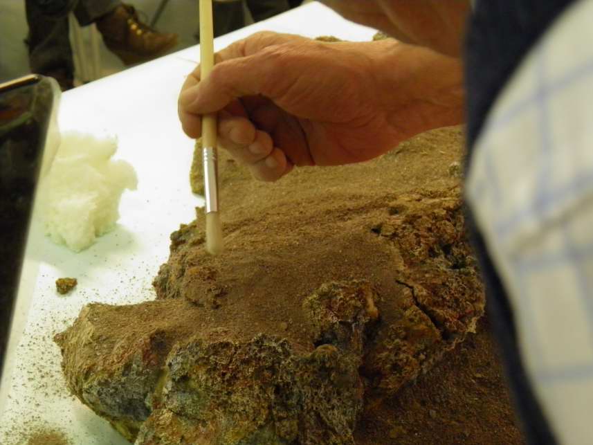 3-Cuando esten secas y duras, procedemos a pintarlas dando veladuras de tonos más claros con pincel seco hasta que estén a nuestro gusto. Continuamos añadiendo al resto del terreno ( nunca a las rocas), en este caso tierra real. Esta se moja con aguacola para que se fije al terreno, usaremos un pulverizador.