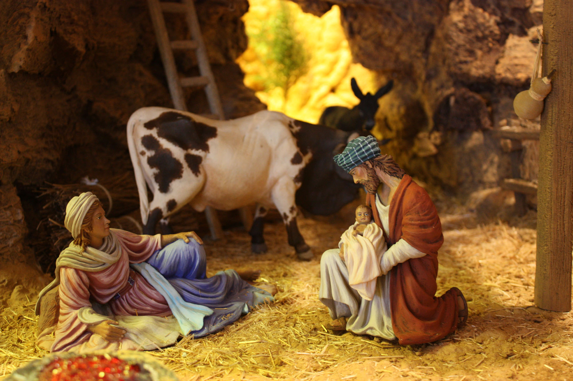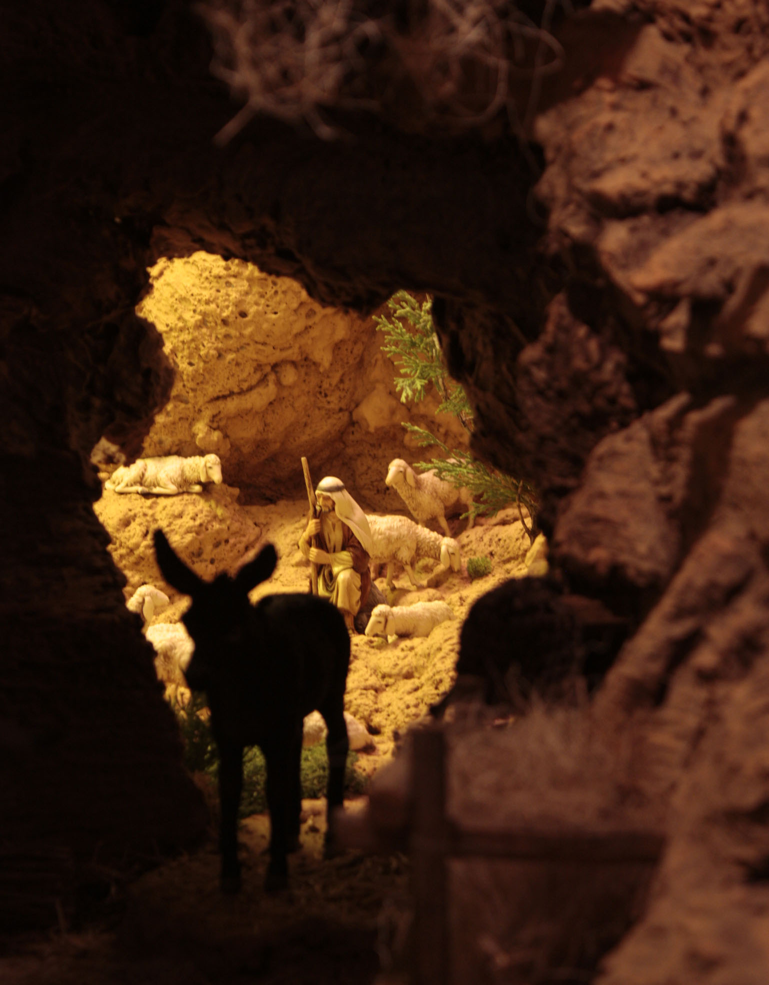Descripción: El Misterio se encuentra dentro de una gruta o cueva de piedra de gran tamaño, hasta el punto que se sale del plano de la embocadura que cierra el montaje. La cueva hace las veces de aprisco para resguardar al ganado; al fondo, por una oquedad, se ve a un pastor con sus ovejas pastando. En el interior de la gruta hay un doblado de madera donde en la parte superior se almacenan grano, harina, cántaras de vino y agua, paja etc. Debajo están la Virgen María, recostada, descansando tras el parto y embelesada mirando al Niño Jesús al cual sostiene San José en sus brazos; son obras realizadas por José Ángel Oviedo. Detrás de la Sagrada Familia están los animales: un buey berrendo y una mula, ambos también estrenados este año y realizados por los Hermanos Cerrada. Los Reyes Magos, adquiridos en Olot (Gerona), ya están postrados adorando a Jesús.