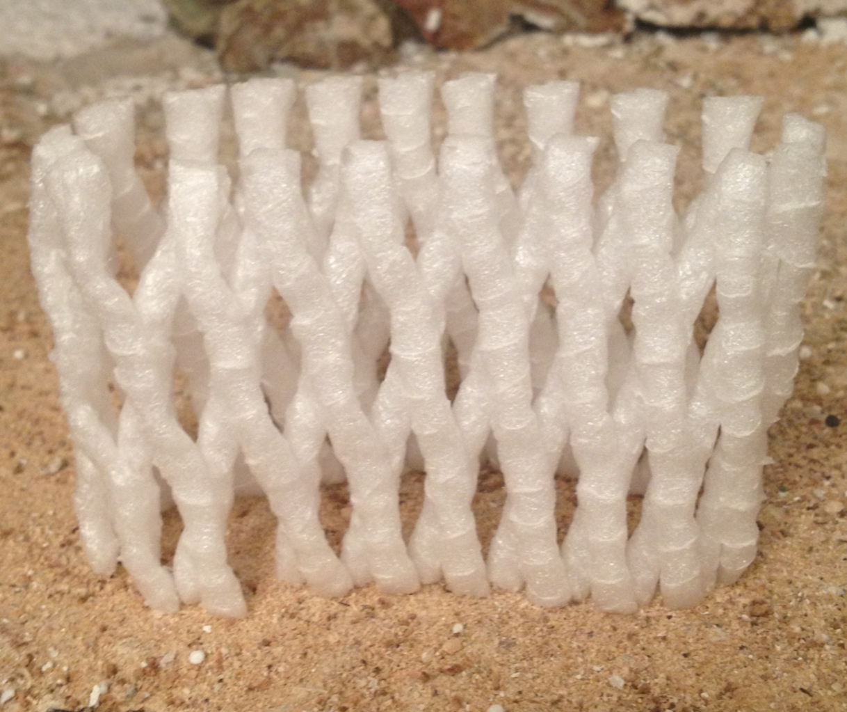 Con un envoltorio de chirimoya, a punto de irse a la basura, hice la prueba. Se moja con escayola líquida, antes de que se seque se le añade color, lo hice con tierras, ocre y un poco de negro. Parece una valla de troncos pequeños y es rápido.
