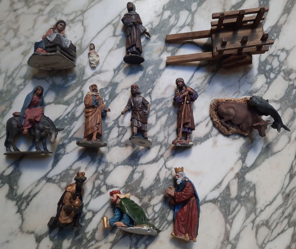 -Buey y mula de marmolina. Le falta un cuerno al buey y restos de paja en peana.......................................5,00 €