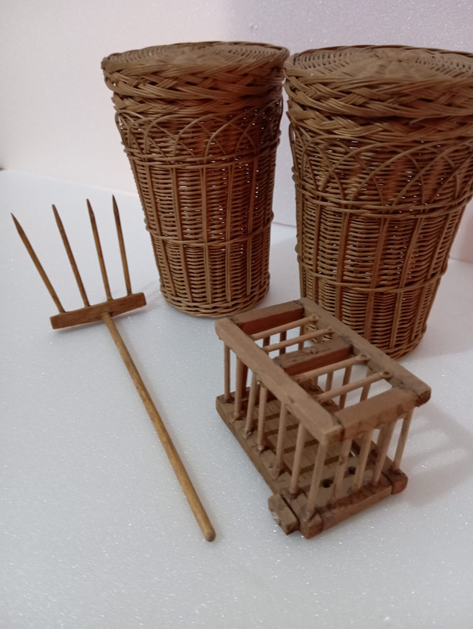 Carro de madera de balsa, conjunto de cántaros, canastos, rastrillo y jaula: 60€.