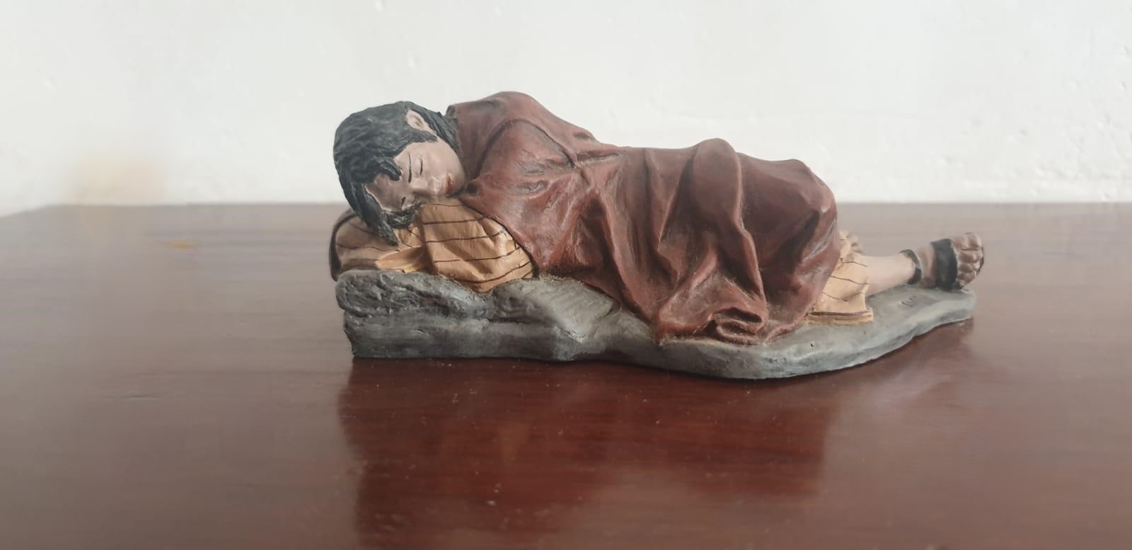 Es una figura de un pastor joven que está descansando/durmiendo sobre tierra.