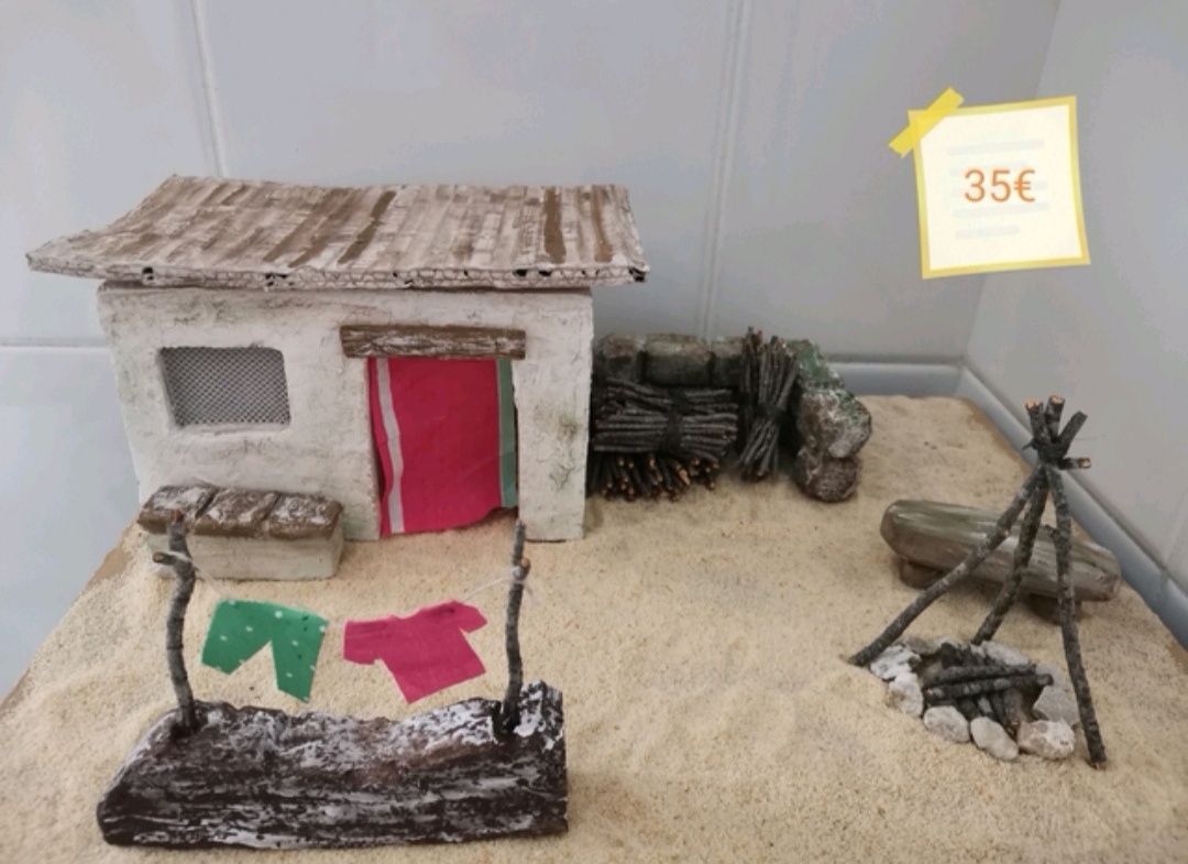 Casa para Belén muy robusta ya que está hecha con poliespan de 3cm y yeso. Tejado de cartón desmontable. Medidas 17cm x 13cm x 10cm de alto. El hueco de la puerta mide 8cm. Ruinas, leña, tendedero y hoguera