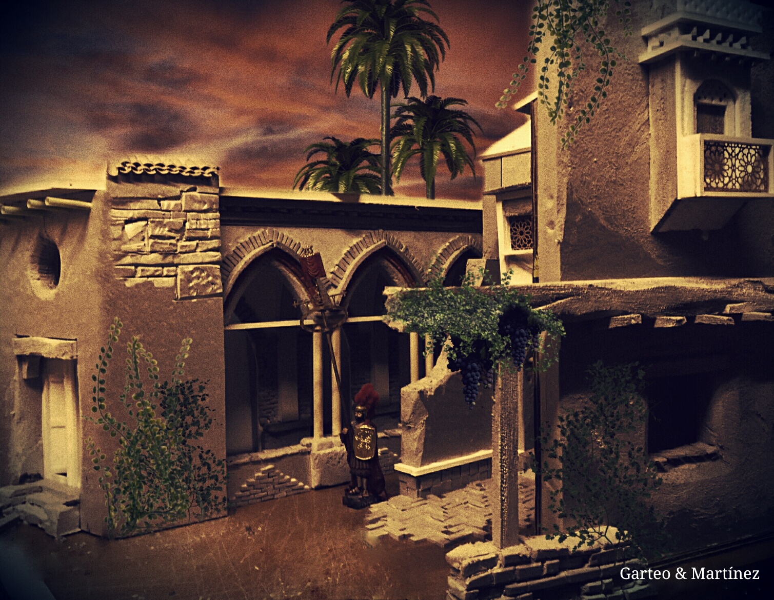 Un diorama titulado "Vía Dolorosa" que estrenaremos en la próxima semana santa. Este trabajo recrea parte del camino que trazó Cristo en su camino hacia el calvario, donde vemos a la Santa mujer Veronica, a Maria Magdalena y a María, las tres, en la escena principal junto a Cristo y al Cirineo. Vereis un gran cortejo Romano y demás personajes de la época. Arquitectonicamente hablando, seguimos con el estilo judeo\árabe y alguna pincelada del gótico.