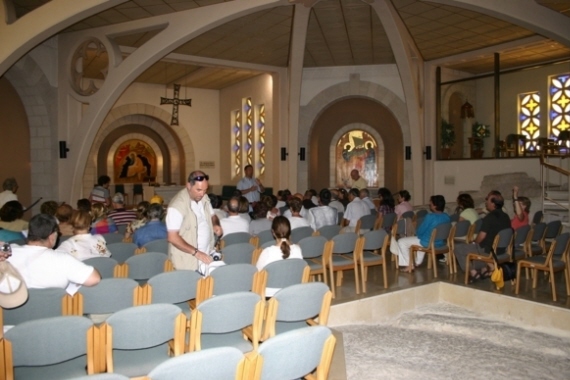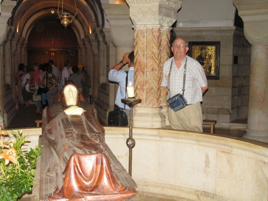 Pero amigos aquí no acabo todo el follon ya que resulta que cuando finalice mi servició con José Luis , me di cuenta que una de las dos velas que alumbraban el Altar estaba apagada, yo con el celo propio de cumplir con mi función hasta el final, saque del bolsillo mi mechero y dale candela al cirio que a pesar de mi insistencia no encendía, resumen que José Luis apiadándose de mi interés dijo: No insistas Carlos que se ha terminado el Gas, y siguió, la Monjita ya me ha avisado de que sucedería………., En la Iglesia sonó una gran carcajada, ya que hacía tan solo un ratito que al visitar el pozo que veréis en las Fotografías, unos cuantos Peregrinos nos encontrábamos en el Fondo de este pozo Cripta donde Jesús fue atado y maltratado, y otros Peregrinos entre ellos Miguel, interesante y buena persona, que desde arriba y mirándonos a los de abajo, nos dijo no os riáis que cuando os tire las botellas de Gas Butano veréis….y me imagino, porque a mi me ocurrió que todos los presentes pensamos si Miguel hubiese tirado las botellas de Butano ahora tendríamos la vela encendida, en fin esta fue la anécdota del viaje, que tampoco estuvo tan mal. Y nuestro artista y Peregrino Juajo plasmó este memorable hecho que desde ese día, lo cuentan los guías a todas las Peregrinaciones, como u8n hecho histórico...ja....ja..., y lo dejó plasmado en (ver ultima Fotografía.