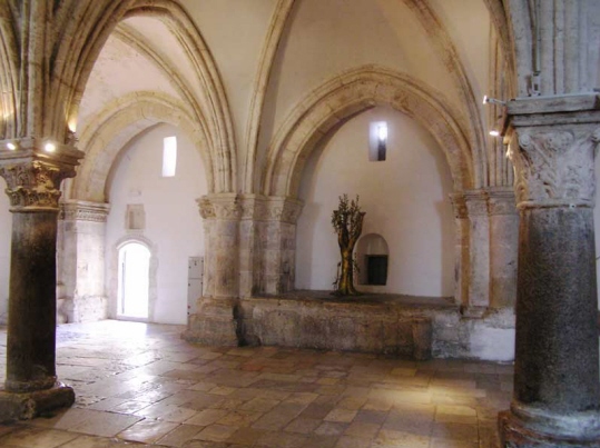 Del patio enclaustrado del convento franciscano del siglo XIV, entramos a la planta baja del edificio, en una habitación que actualmente sirve como sinagoga. La puerta a la derecha da entrada a una sala de oración. Las mujeres no tienen permitido el acceso aquí. En el muro del sur hay un mihrab cubierto de azulejos de cerámica construido en el período mameluco (hoy en día oculto detrás de una biblioteca!).
