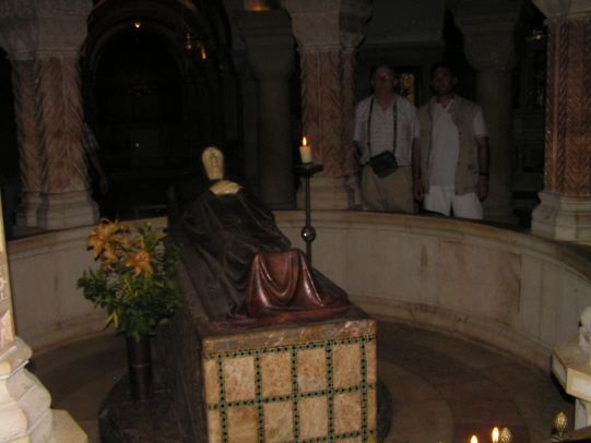 Pero amigos aquí no acabo todo el follon ya que resulta que cuando finalice mi servició con José Luis , me di cuenta que una de las dos velas que alumbraban el Altar estaba apagada, yo con el celo propio de cumplir con mi función hasta el final, saque del bolsillo mi mechero y dale candela al cirio que a pesar de mi insistencia no encendía, resumen que José Luis apiadándose de mi interés dijo: No insistas Carlos que se ha terminado el Gas, y siguió, la Monjita ya me ha avisado de que sucedería………., En la Iglesia sonó una gran carcajada, ya que hacía tan solo un ratito que al visitar el pozo que veréis en las Fotografías, unos cuantos Peregrinos nos encontrábamos en el Fondo de este pozo Cripta donde Jesús fue atado y maltratado, y otros Peregrinos entre ellos Miguel, interesante y buena persona, que desde arriba y mirándonos a los de abajo, nos dijo no os riáis que cuando os tire las botellas de Gas Butano veréis….y me imagino, porque a mi me ocurrió que todos los presentes pensamos si Miguel hubiese tirado las botellas de Butano ahora tendríamos la vela encendida, en fin esta fue la anécdota del viaje, que tampoco estuvo tan mal. Y nuestro artista y Peregrino Juajo plasmó este memorable hecho que desde ese día, lo cuentan los guías a todas las Peregrinaciones, como u8n hecho histórico...ja....ja..., y lo dejó plasmado en (ver ultima Fotografía.