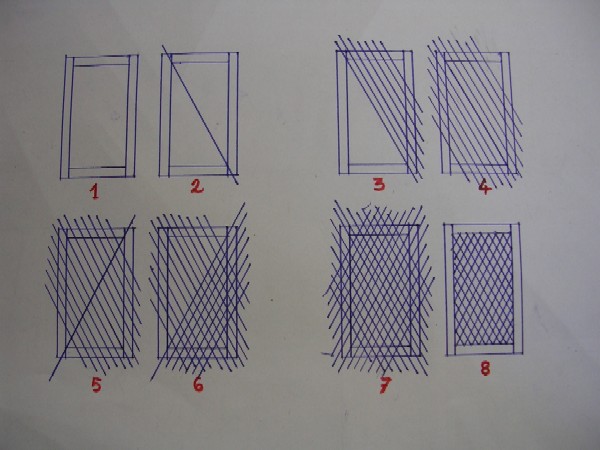 Segundo .- Corto tiras de madera y empiezo a pegarlas con cola blanca traslucida siguiendo el orden que indico en los dibujos números 2, 3, 4, 5, 6 y 7.