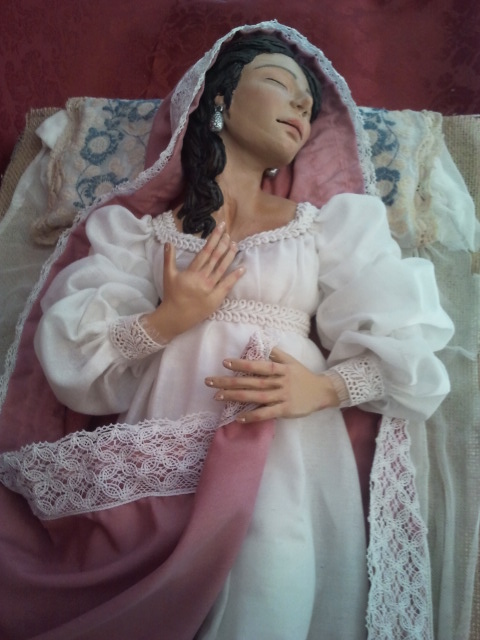 Se ha quedado preciosa,me gusta,pero la veo muy delgada y el pelo (se que dices que te falta algo) creo que un matizado no quedaría mal ya que así creo que es demasiado oscuro,otra cosa,le has hecho alguna herida en el ídice izquierdo? es que da la impresión en las fotos,si no es así,difuminaló en ese lado porque se ha quedado demasiado marcado el nudillo y lo parece,a la comisura de los labios también le suavizaría algo el color,creo que es algo oscuro.Te felicito por dos cosas....Primero la pintura y segundo por las vestiduras porque las has escogido con mucho acierto....Enhorabuena.